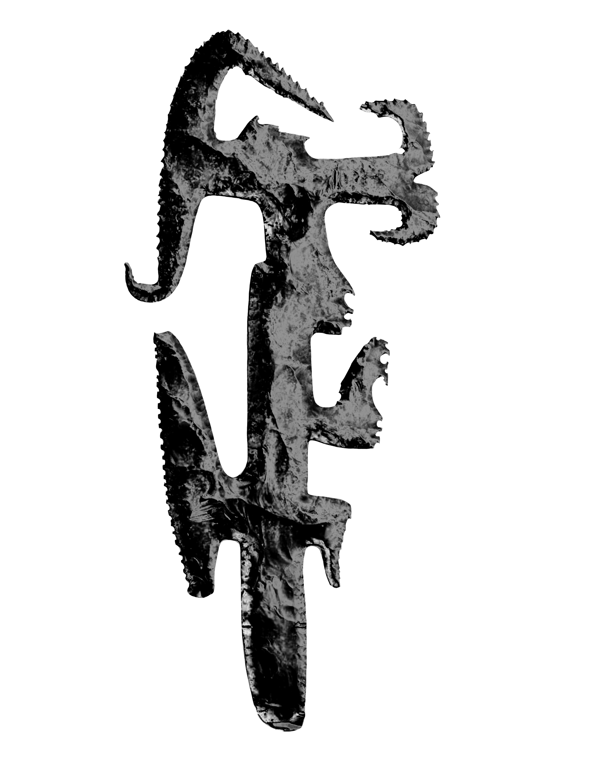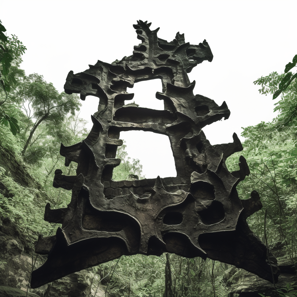 Visual representation of a sculpture made of recycled styrofoam and treated to mimic volcanic rock, the sculpture was generated using obsidian ceremonial knives as the point of reference that AI translates into what their database understands as prompts describe. In this case, I was using Mid Journey, the obsidian knife used is the one below.