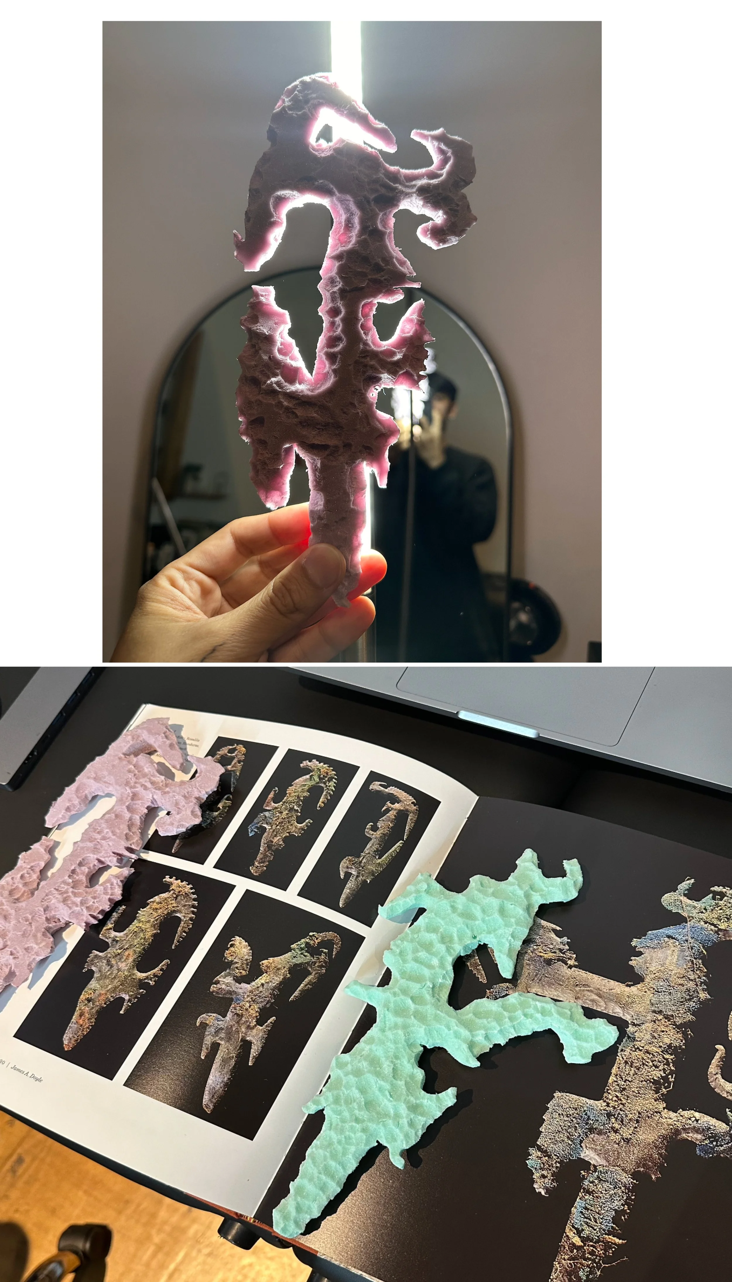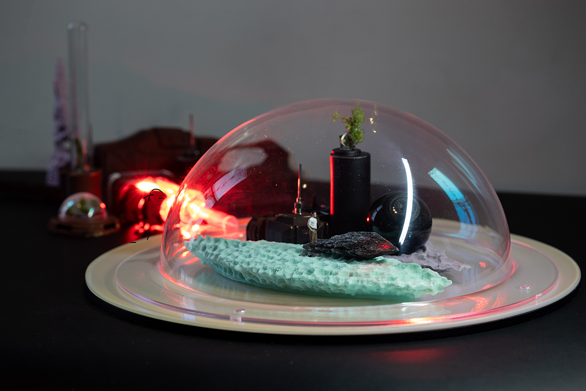 Second: site-specific sculptures and dioramas, mini sculptures and 3D-printed masks, traditional media drawing, paintings, and photography.